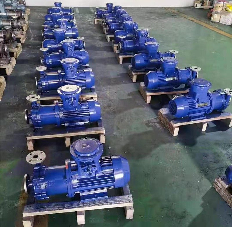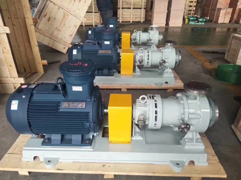 CQB(R)磁力泵通常由电动机;磁力偶合器和耐腐蚀离心泵组成。其主要特点是利用磁力偶合器传递动力:完全无泄漏,当电动机带动磁力偶合器的外磁钢旋转时:磁力线穿过问隙和隔离套,作用于内磁钢上使泵转子与电动机同步旋转,无机械接触地传递扭矩。在泵轴的动力输入端,由于液体被封闭在静止的隔离套内,没有动密封因而完全无泄漏。