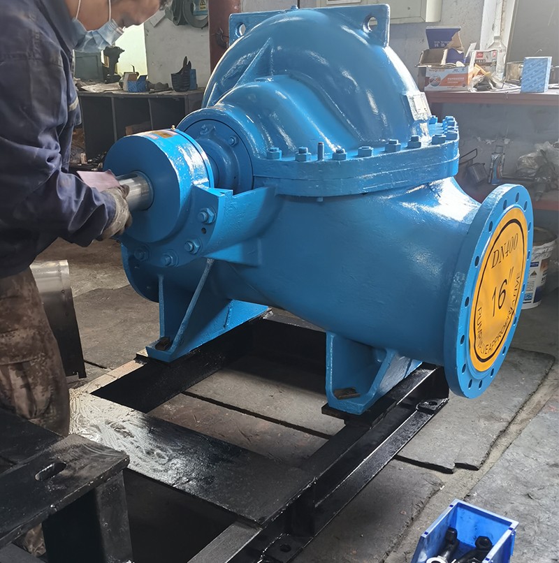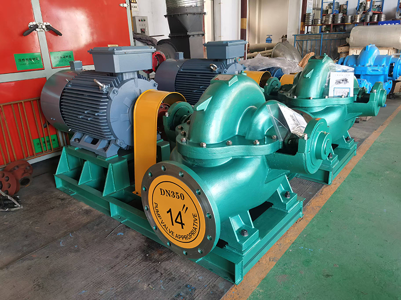 结构设计:单 级双吸轴向中开蜗壳离心泵,卧式安装.驱动机(电动机或内燃机)可根据需要设置在泵的左侧或右侧(即面向出口,驱动机在左侧为逆时针旋转.在右侧为顺时针旋转)。